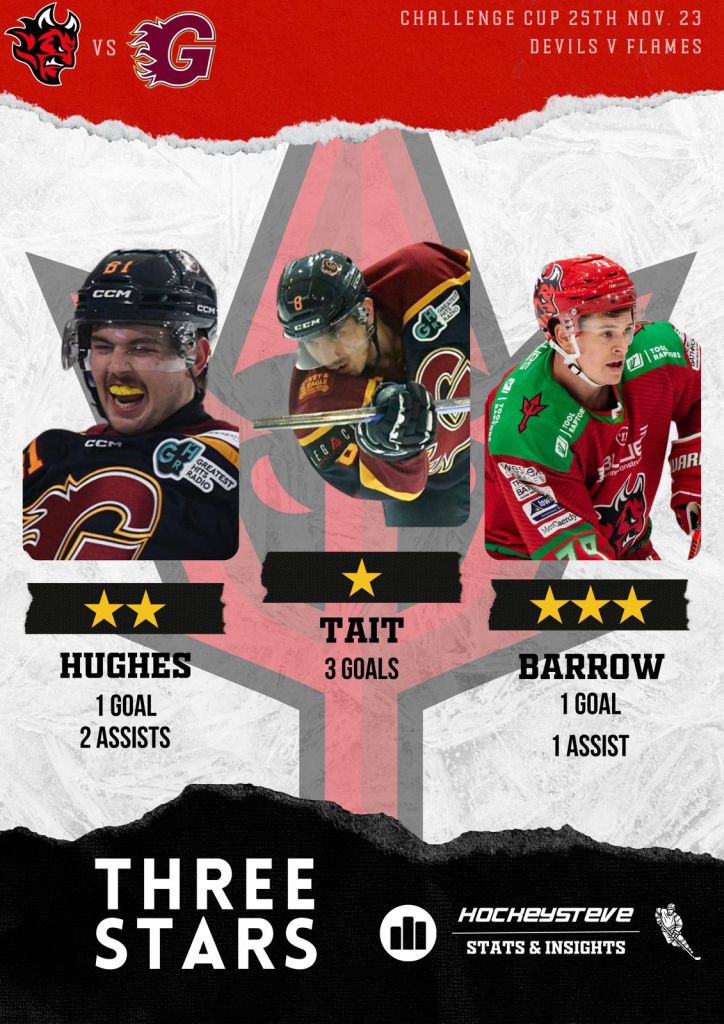 3. Up against it and a dwindling barn, the Devils did fight back often to try and Essen the gap. Barrow and Waller netted twice to half the deficit, but the Flames hit back to reclaim their lead to four again in quick succession. Later in the third, the Devils pushed right back, pulling the goalie twice to go within one, before Tait concluded proceedings (and his hat-trick) with an empty netter.