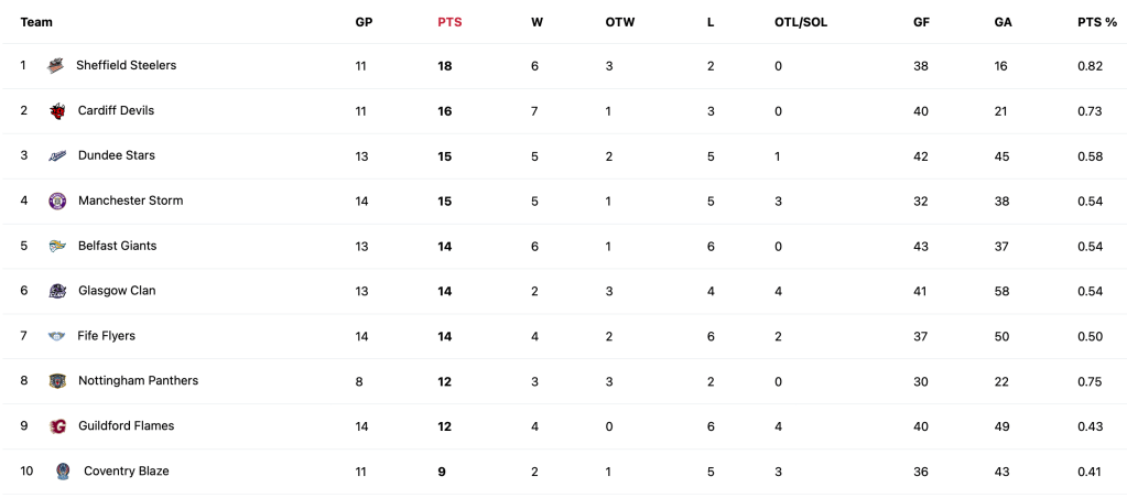 Current League Standings, taken via EIHL @ https://www.eliteleague.co.uk/standings
