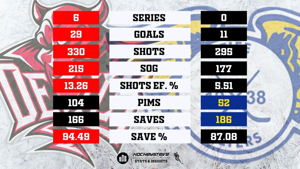 The series so far has gone the way of the good guys, commanding a 4:1 lead into their final regular season match up. During this series, 32 goals have been scored with Devils taking the majority at 19:13.