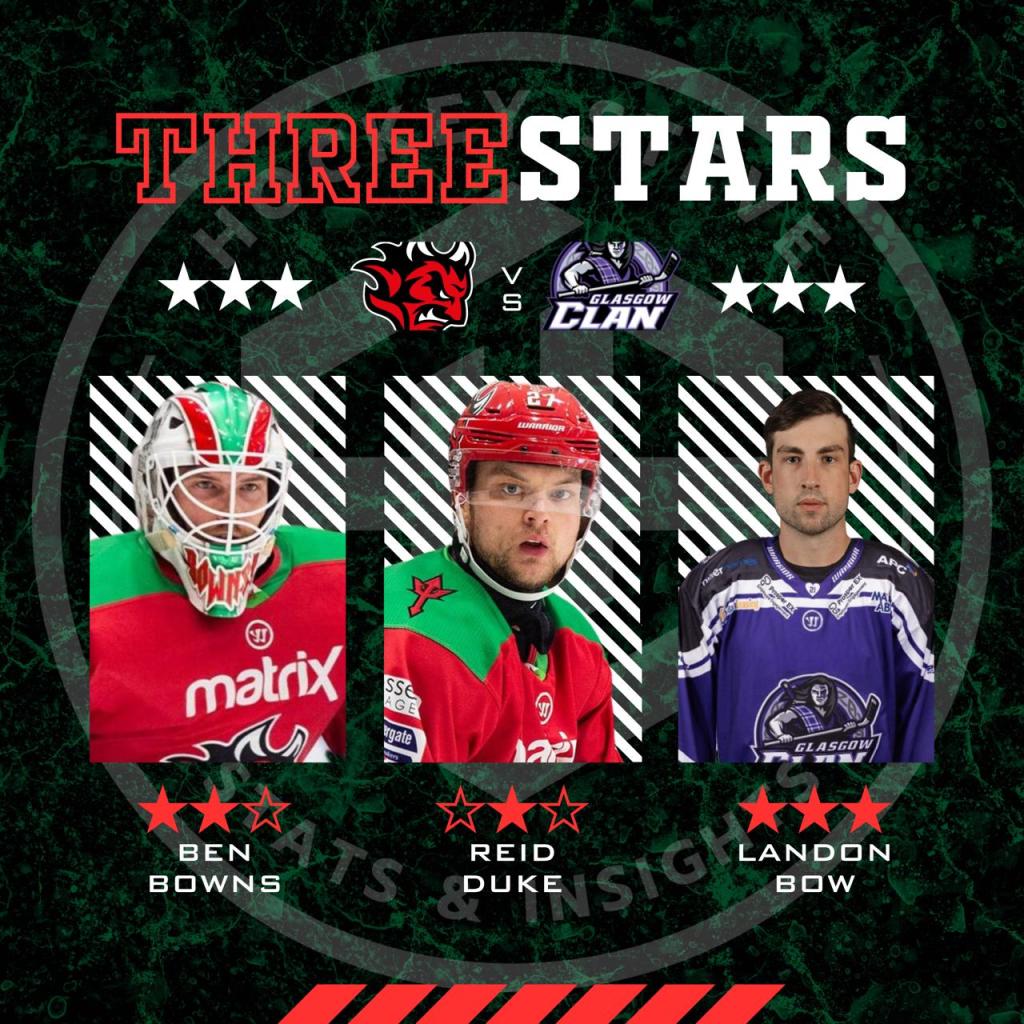 97.14 SV% for Bowns and 94.44 SV% for Bow needs to be recognised. Reid Duke for me completed the selection with his two goals in a hard fought game against really determined opponents.