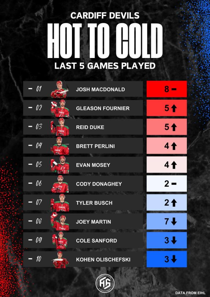 Josh MacDonald leads the league in points (35) and goals (20) in 28GP with 3 of his own PPG’s, with Martin also on the same on the special teams, who is three points away from 30, having his best season for several years.