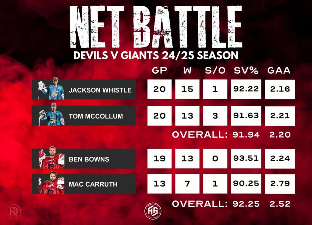 This double header will be the 4th and 5th meetings between these team, with Giants narrowly and against the flow of play winning two, then dominating a third game. This lead to a windfall of 3 wins leaving Devils only able to manage one point from six, so far against their biggest rivals this season.