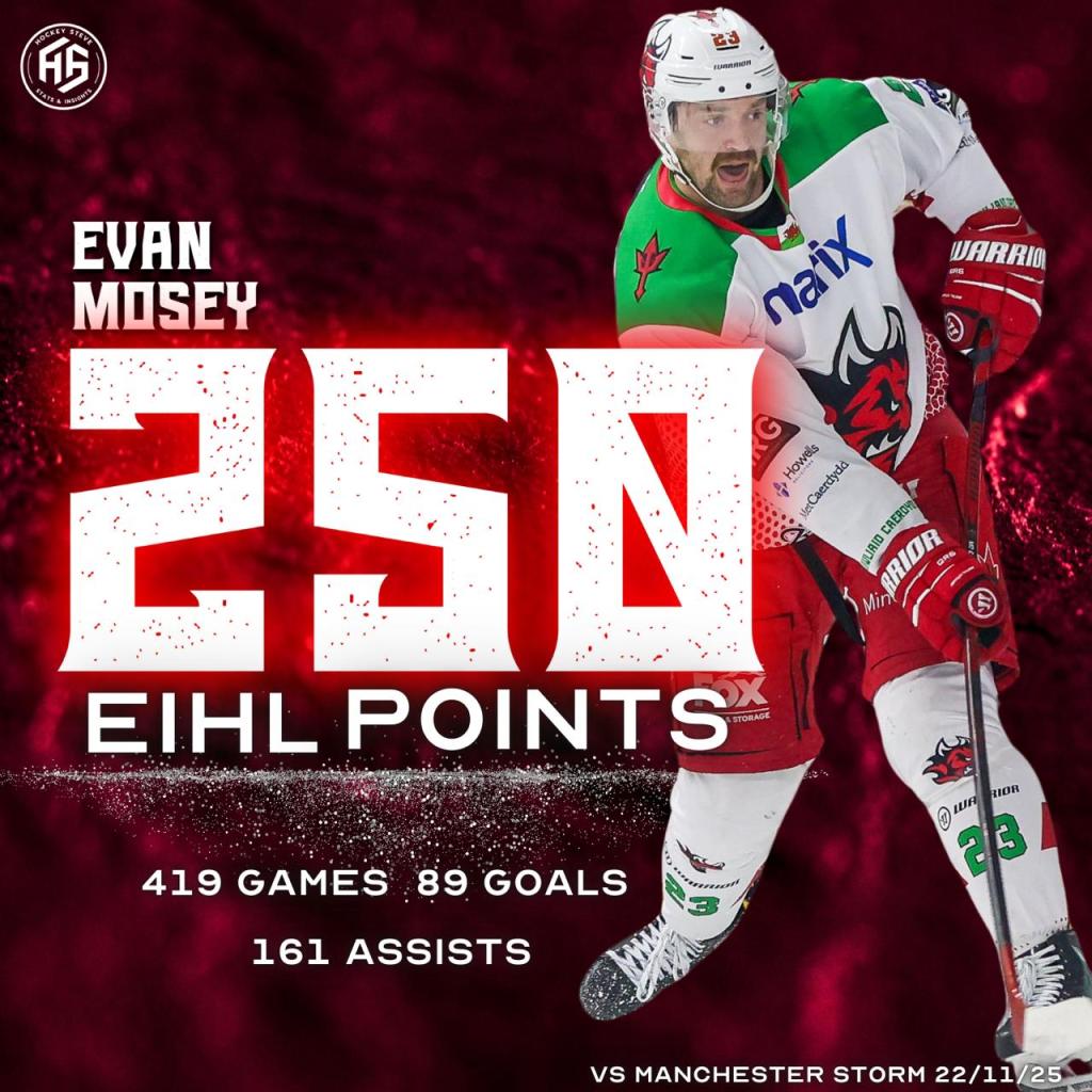Evan Mosey on the weekend wasn’t the only player to hit some milestones. Only last season he earned 100 points as a Devil, on Saturday, he notched up to 250 for his EIHL career, spent at Devils, Panthers and Steelers.