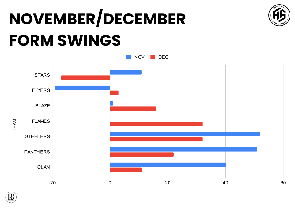 Chart outlining the swings in form across the table, from Steelers to Stars, with blue for November and red for December.