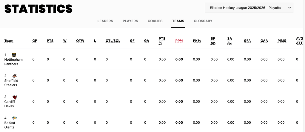 At the time of writing, there are no official EIHL stats for the playoffs at all on their public website (seen below), so it is difficult to determine rates of success for comparative analysis.